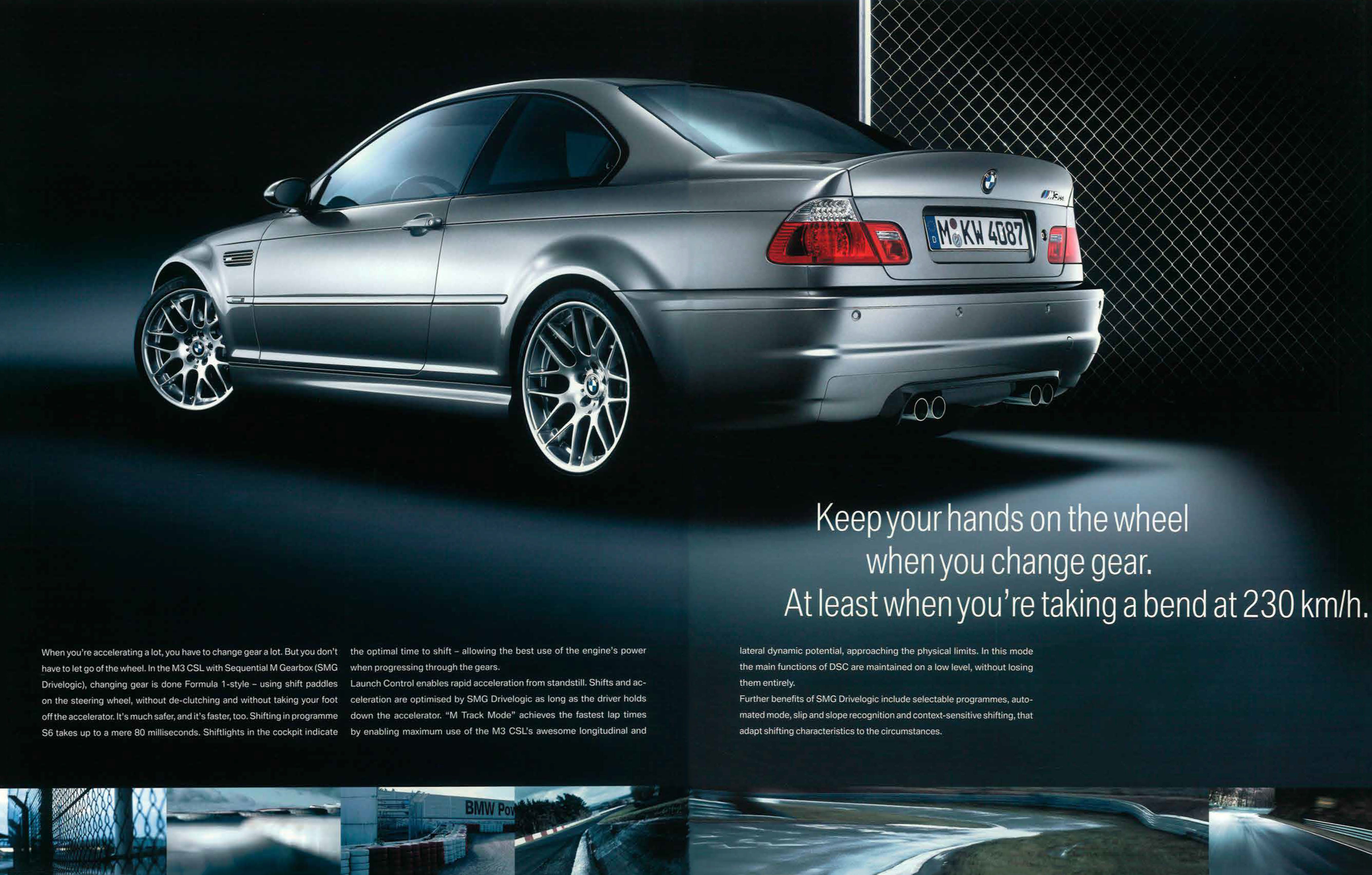 By the second page of the 2003 BMW M3 CSL brochure, you already realise that you are not actually being sold anything. A silver coupe, studio-lit against blackness, in front of wire mesh that suggests a racing paddock rather than a showroom. The headline reads: “The M3 CSL driver talks about significantly increased lateral dynamic performance. The passenger keeps quiet.”